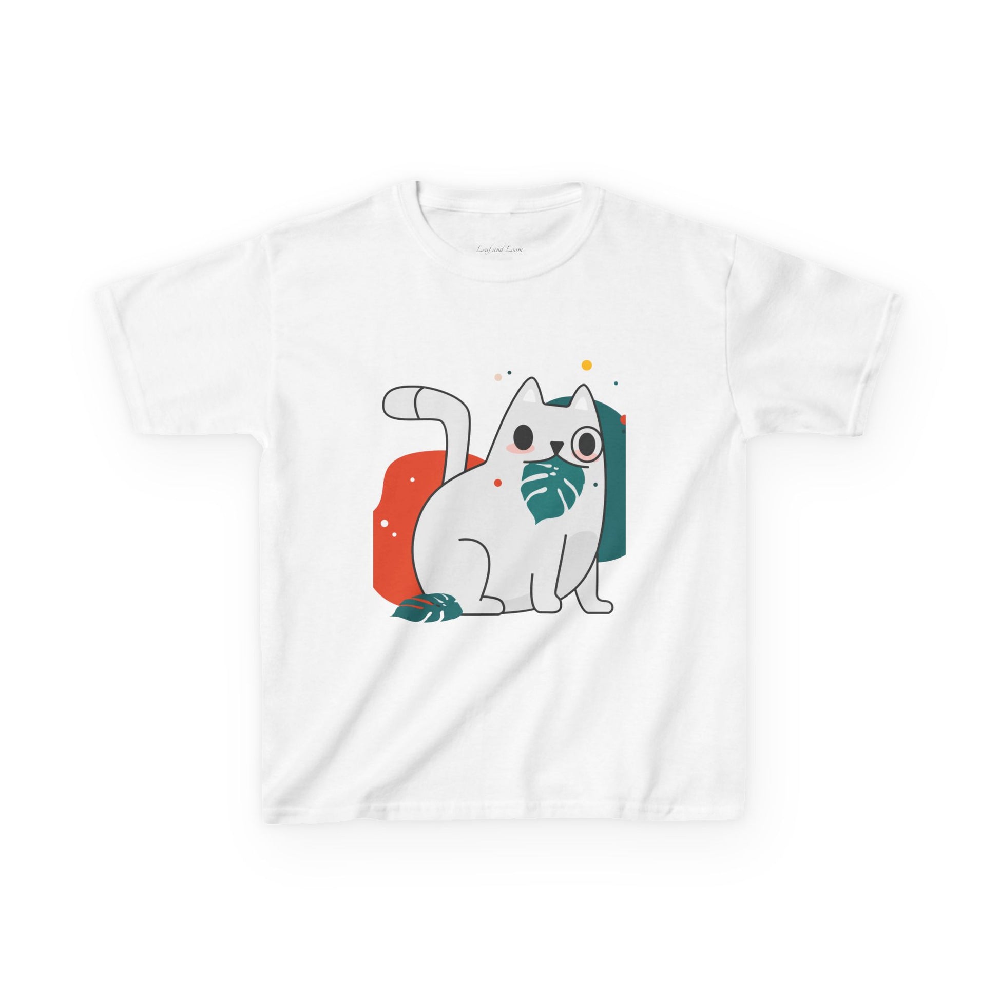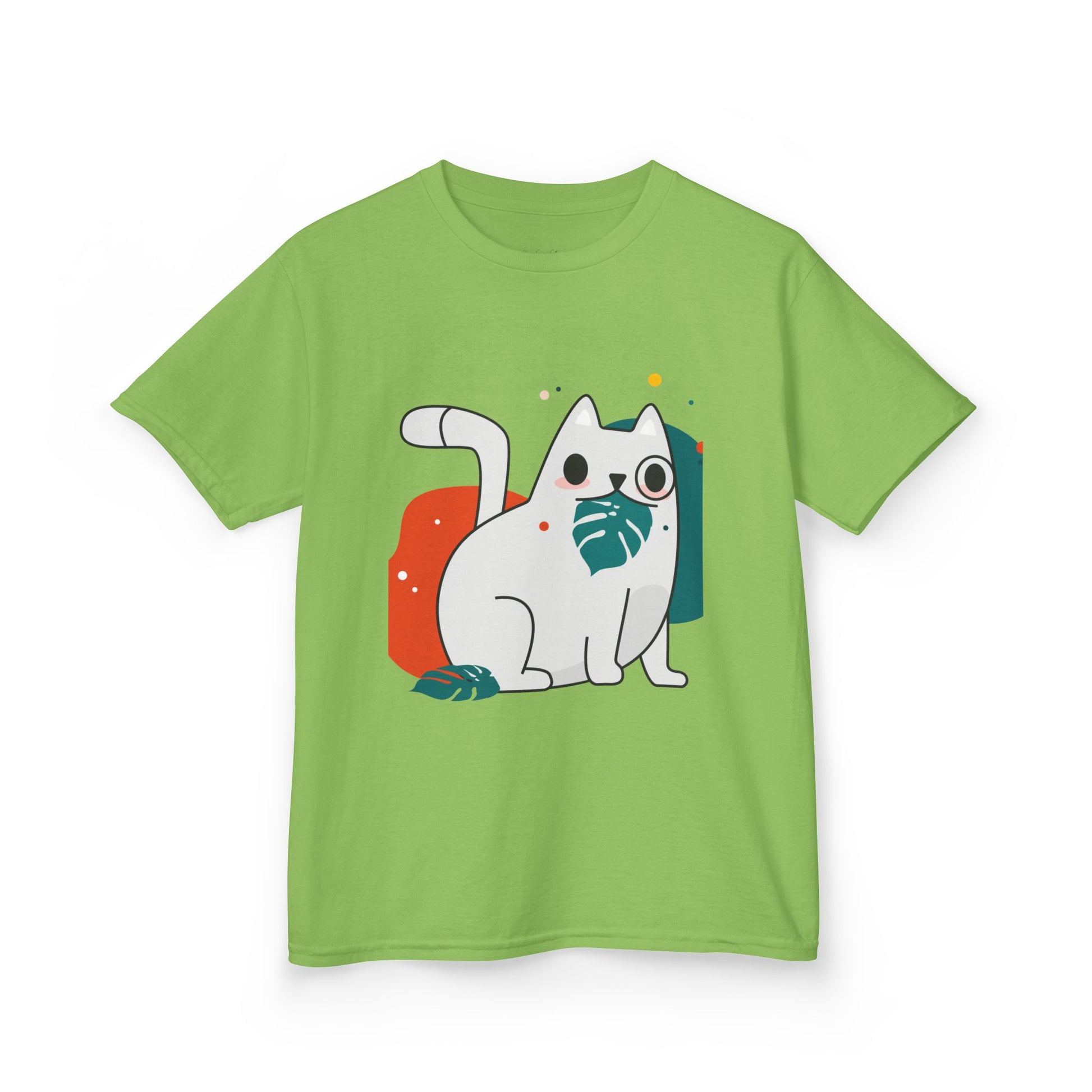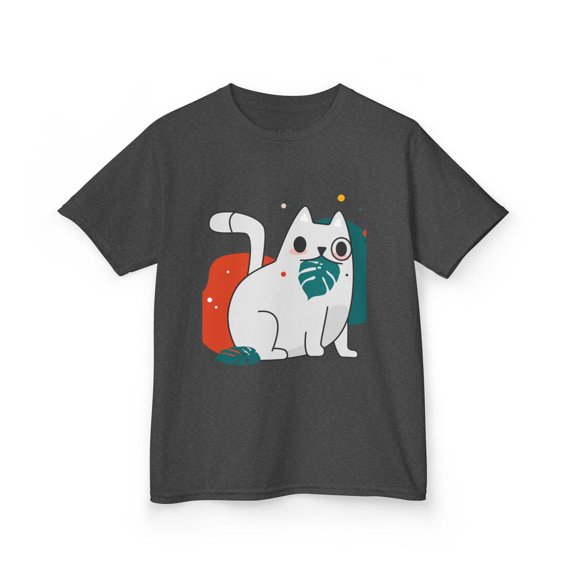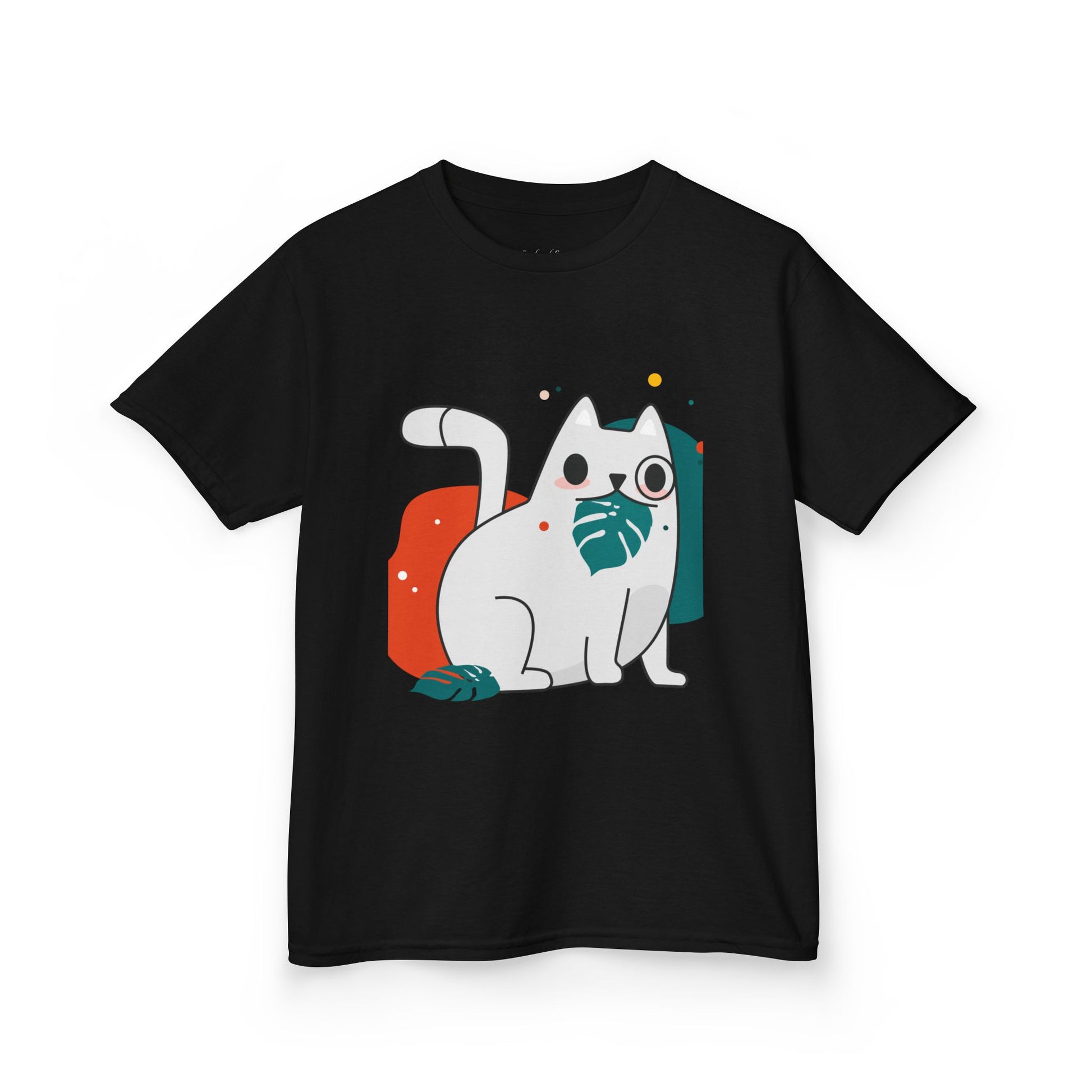 A cute and playful Kids Tee featuring a cat eating a monstera plant design. This tee exudes a fun and whimsical vibe that is perfect for kids who love animals and nature. Ideal for everyday wear, playdates, and casual outings. Great for birthdays, holidays, and special occasions.