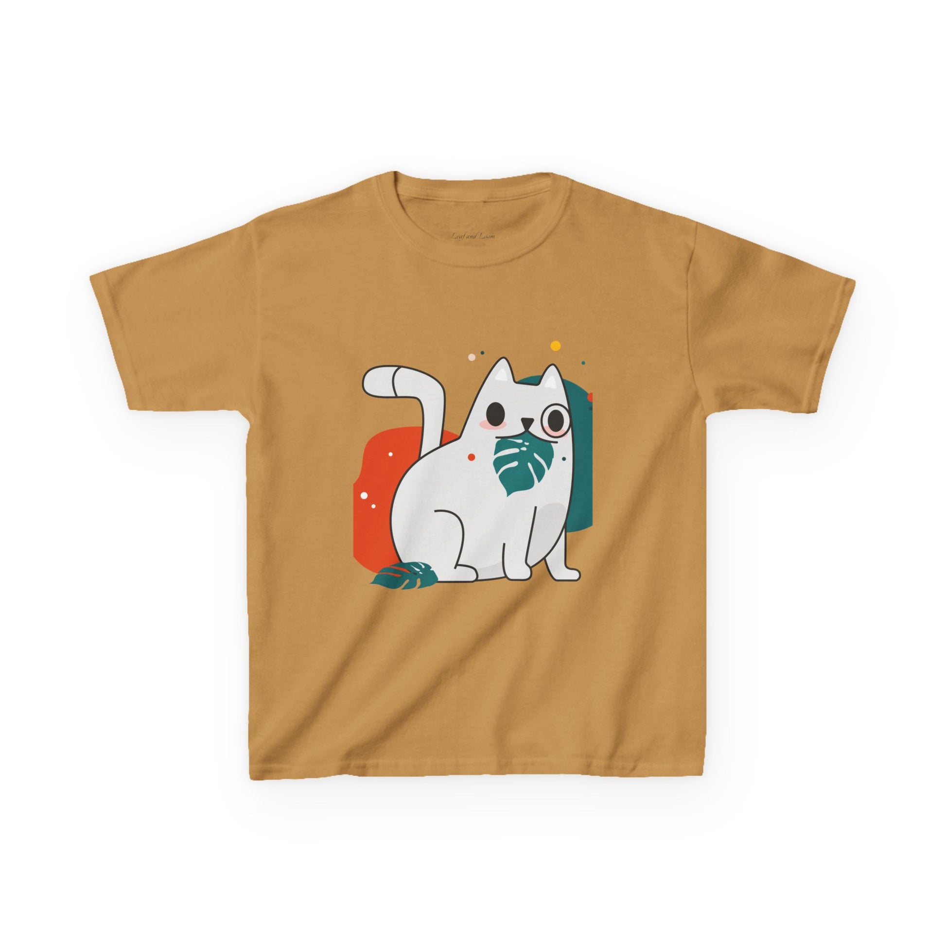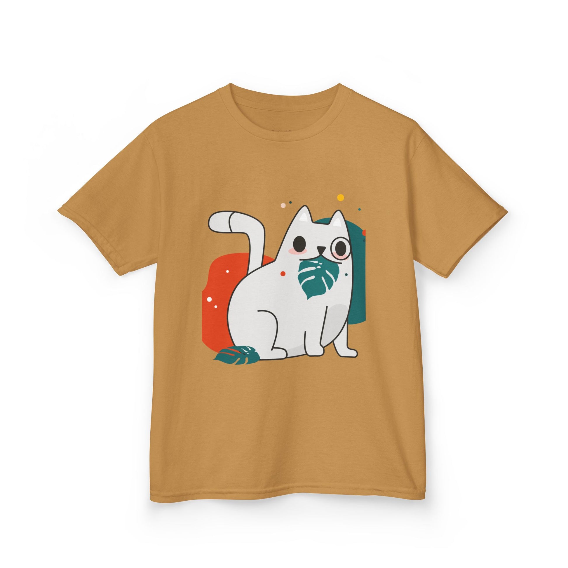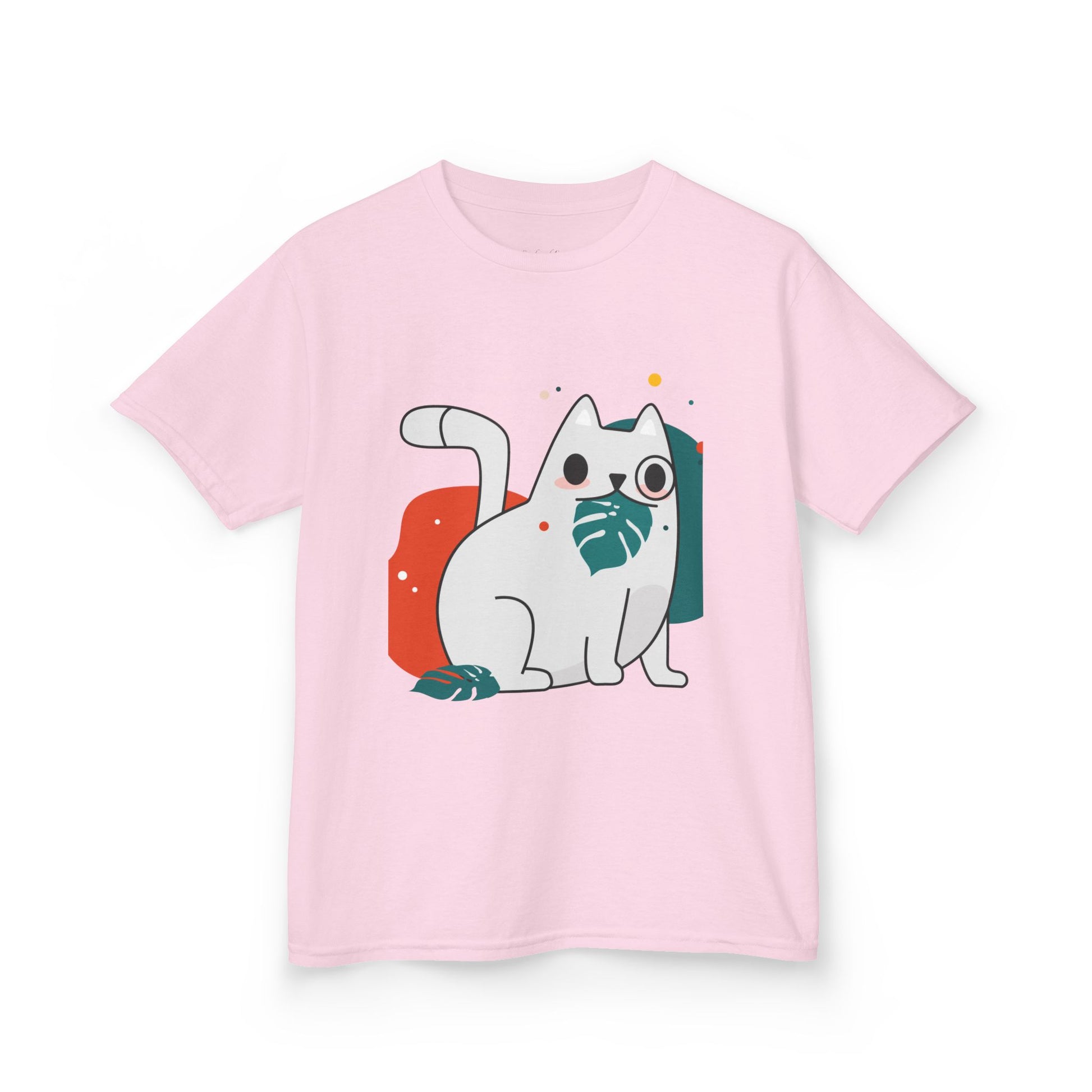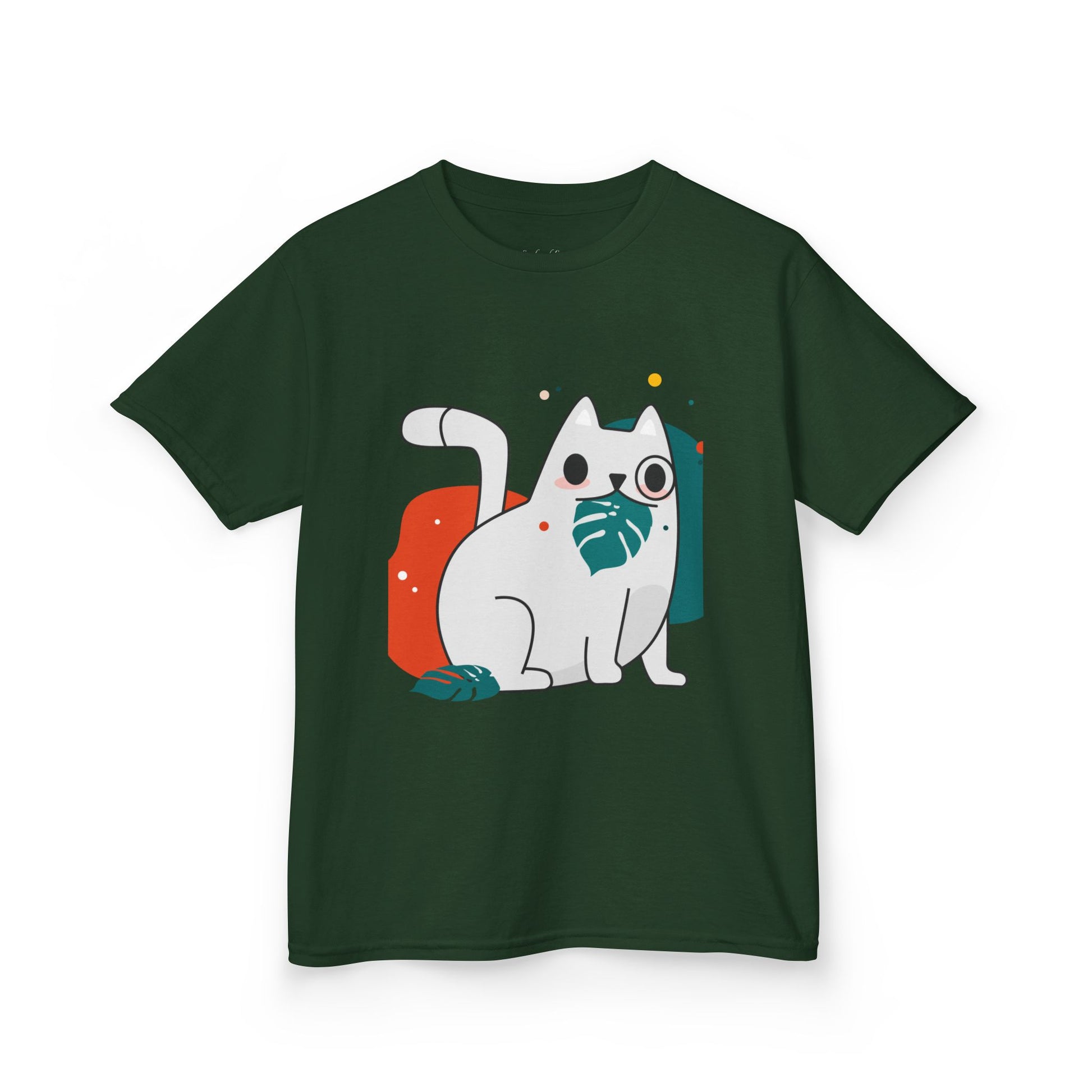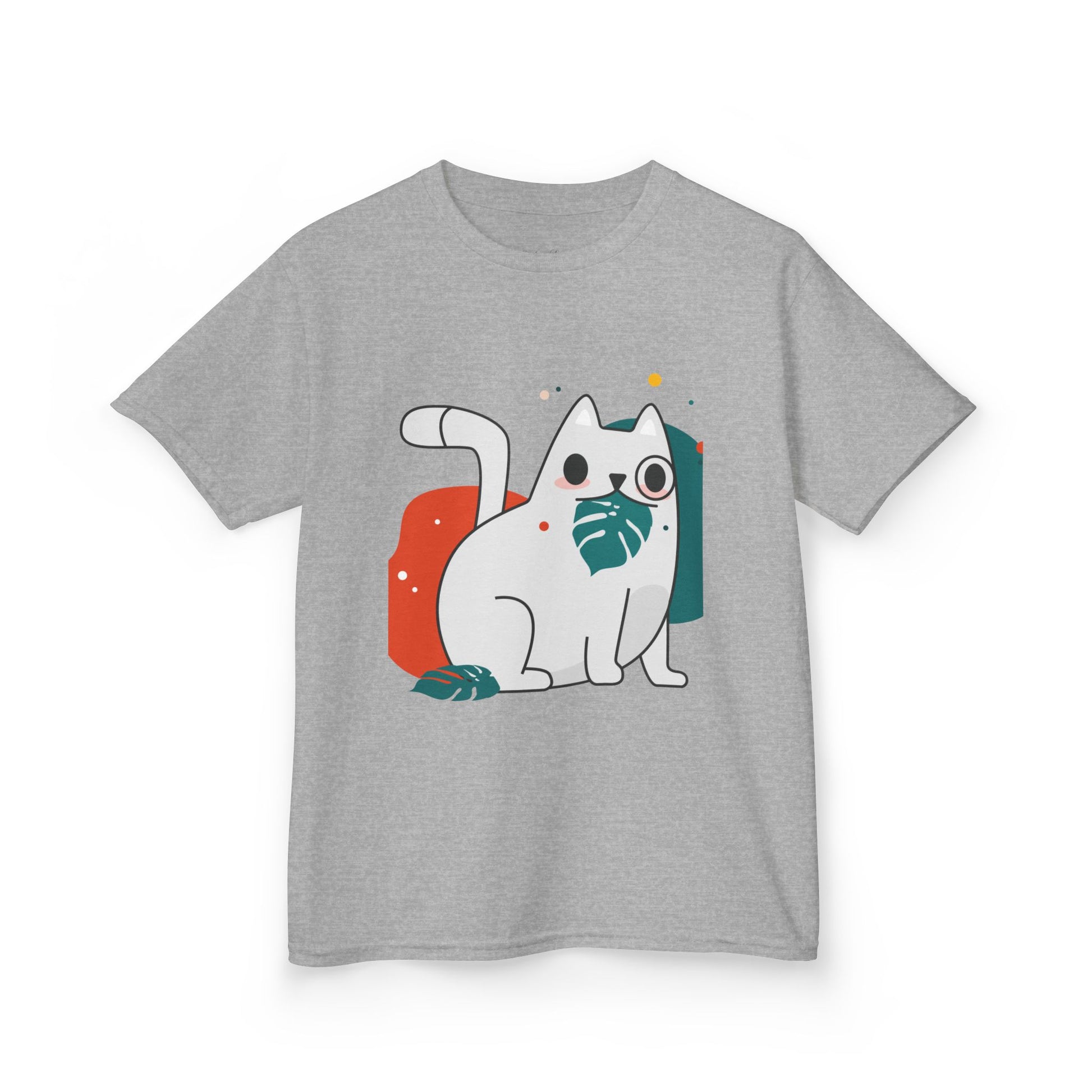 A cute and playful Kids Tee featuring a cat eating a monstera plant design. This tee exudes a fun and whimsical vibe that is perfect for kids who love animals and nature. Ideal for everyday wear, playdates, and casual outings. Great for birthdays, holidays, and special occasions.